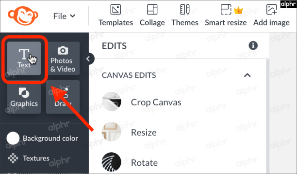 - In the image options menu on the left side, select “Text.”