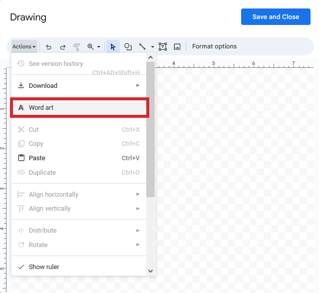 3. Click on “Actions.” Choose “Word Art.”