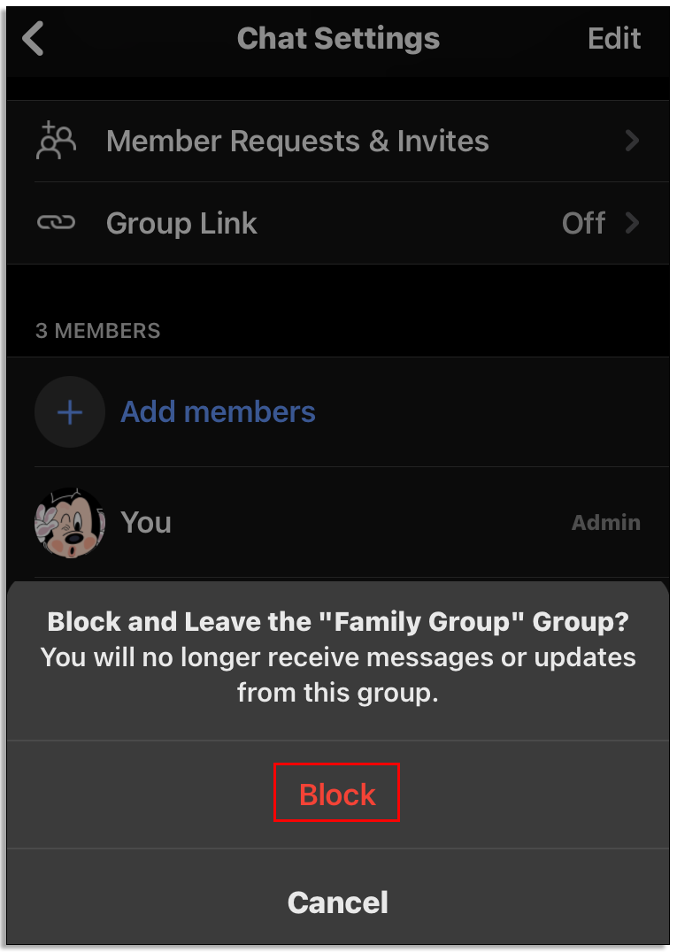 - Once you are the only one left in the group, tap on the group’s name again and scroll down to tap “Block group” or “Leave group.”