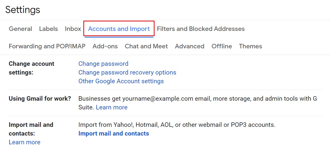 - Go to the “Accounts and Import” tab and click on “Import mail and contacts.”