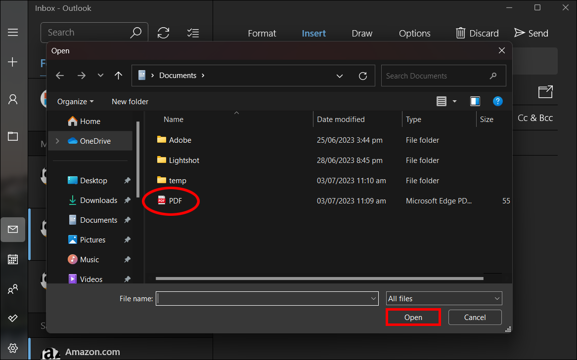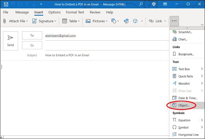 In some email applications, you can embed a PDF in an email with the Insert function. This generally works on older email clients, so if this doesn’t work for you, continue reading for more embedding options.