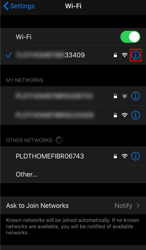 - Tap the i icon next to the network name. The network has to be the network whose router you’re trying to access.