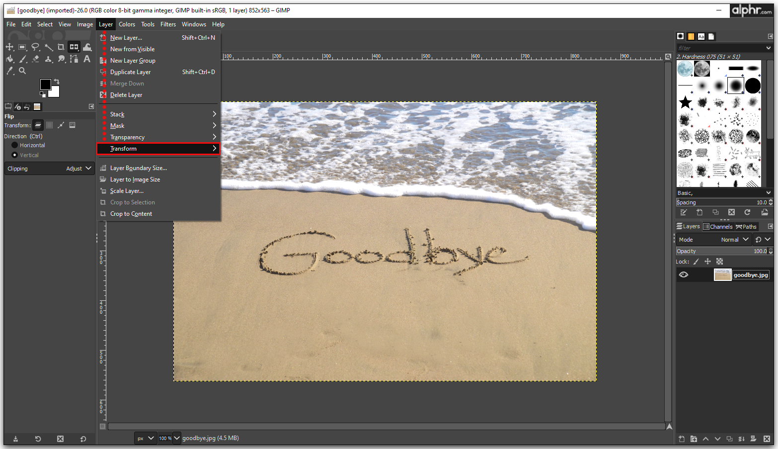 Transforming options are enormously powerful tools in image editing. To flip one layer of the image, follow these steps: