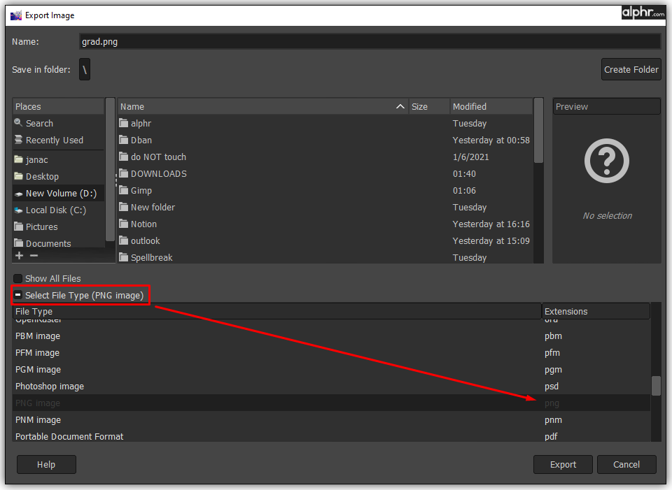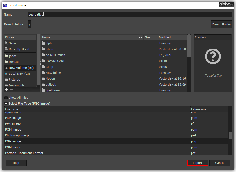 Now that you’ve created a new image, you can export it from GIMP: