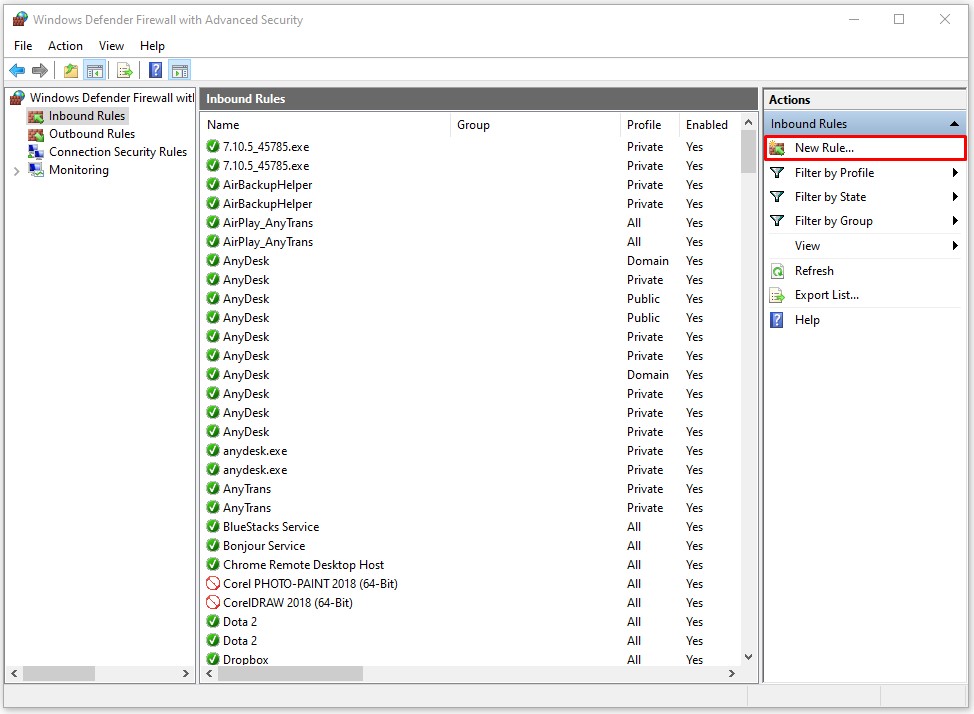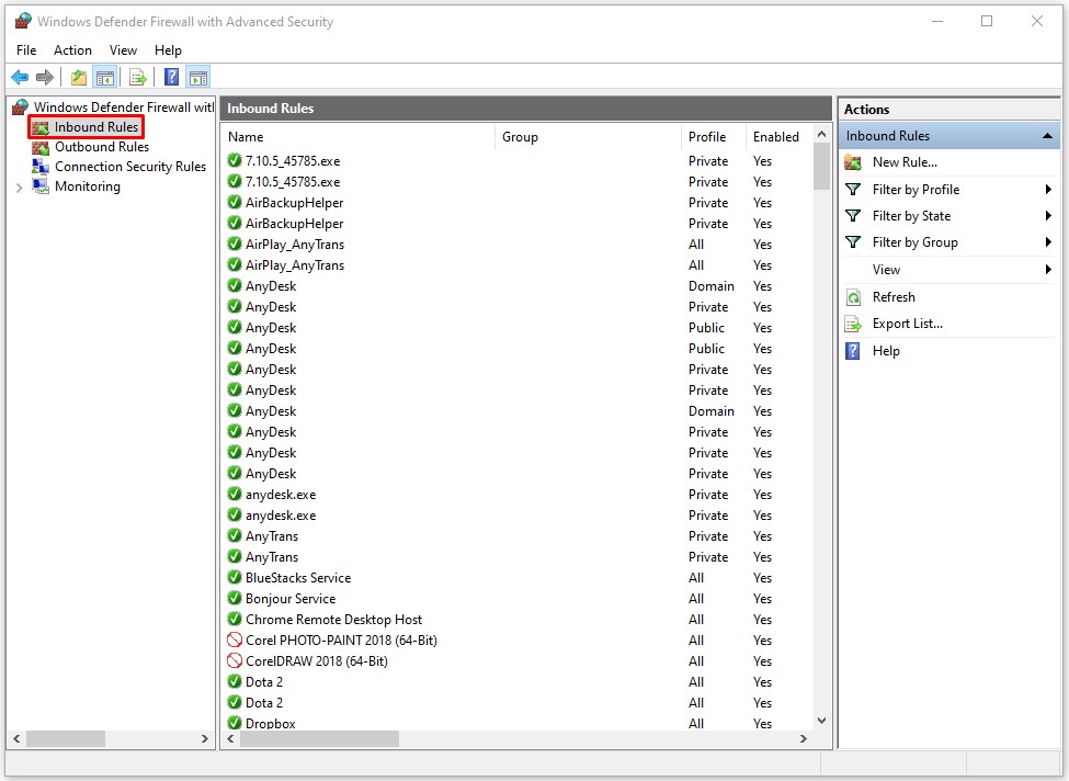 - Click “Inbound Rules” on the menu to the left. In the main portion of the window, you should now see various rules you already have in your system.