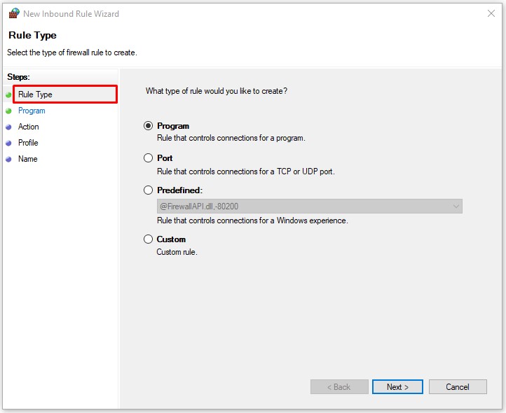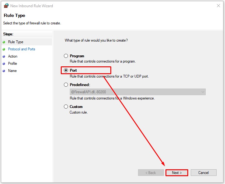 - The “New Inbound Rule Wizard” window opens. Click “Rule Type” on the left menu.