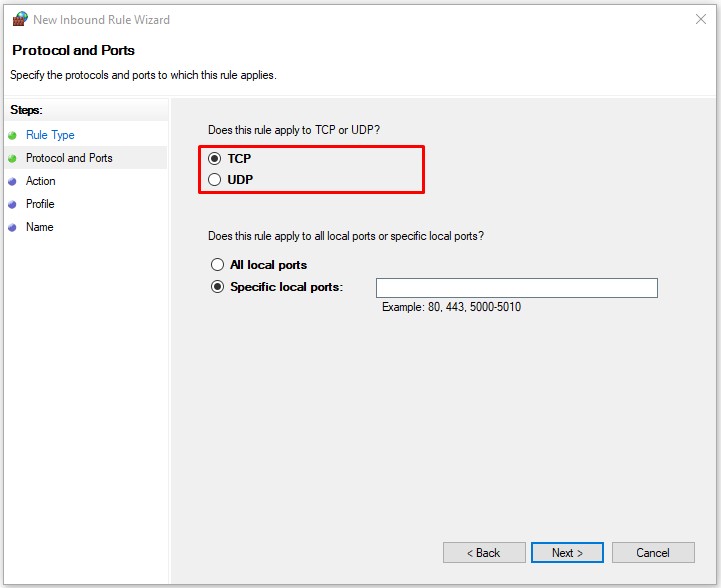 - Depending on which protocol you want to use, either check the “TCP” or “UDP” radio button.