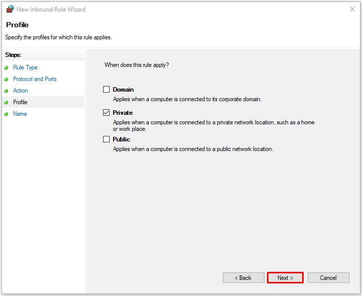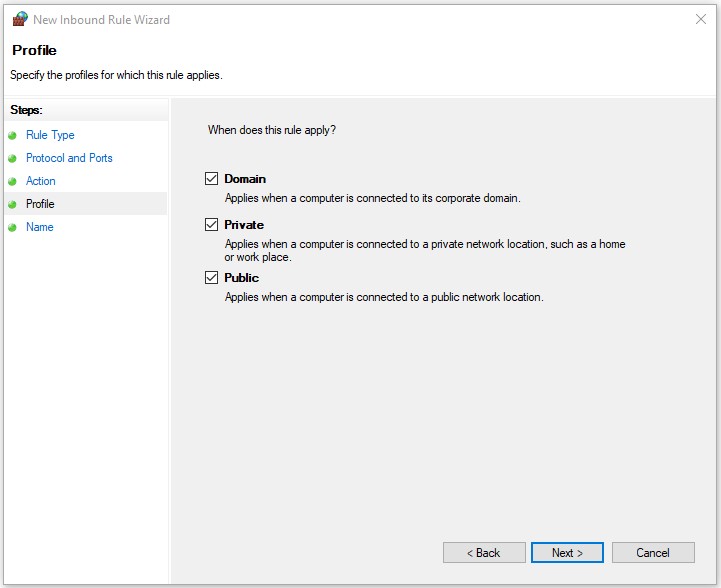 - Now select the network types you want this rule to apply to. You can select each of the following: Domain, Private, Public. Please be aware that allowing a forwarding rule to work on public networks may compromise your computer’s security.