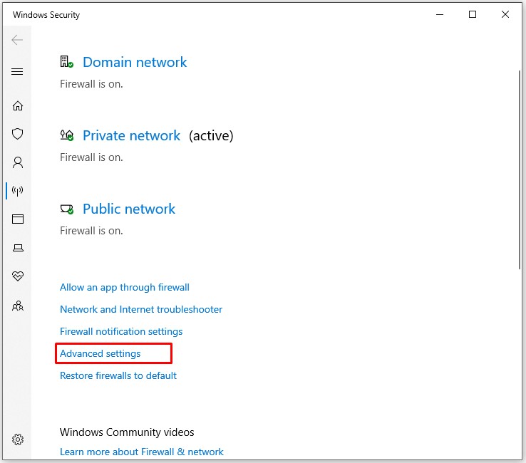 - A separate “Windows Security” window opens. Click “Advanced settings” in the lower portion of the main window.