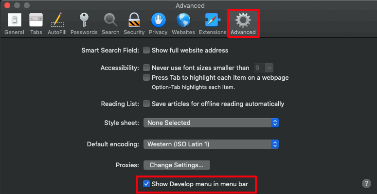 - Select Advanced and tick the Show Develop menu in the menu bar checkbox.