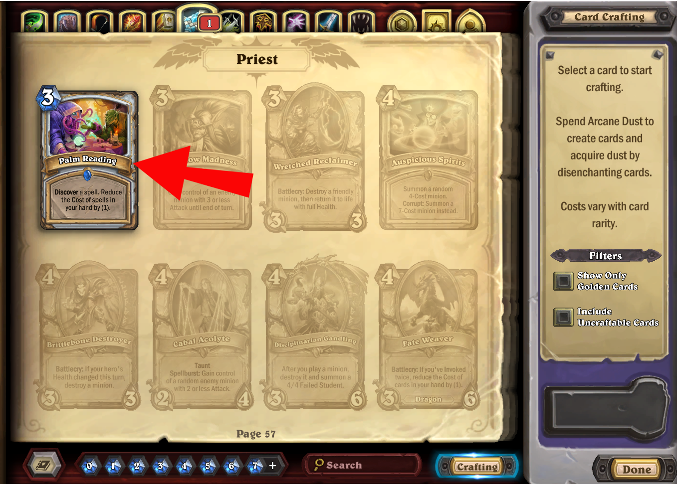 - Click on a card, then press “Disenchant” to convert the card into Dust.