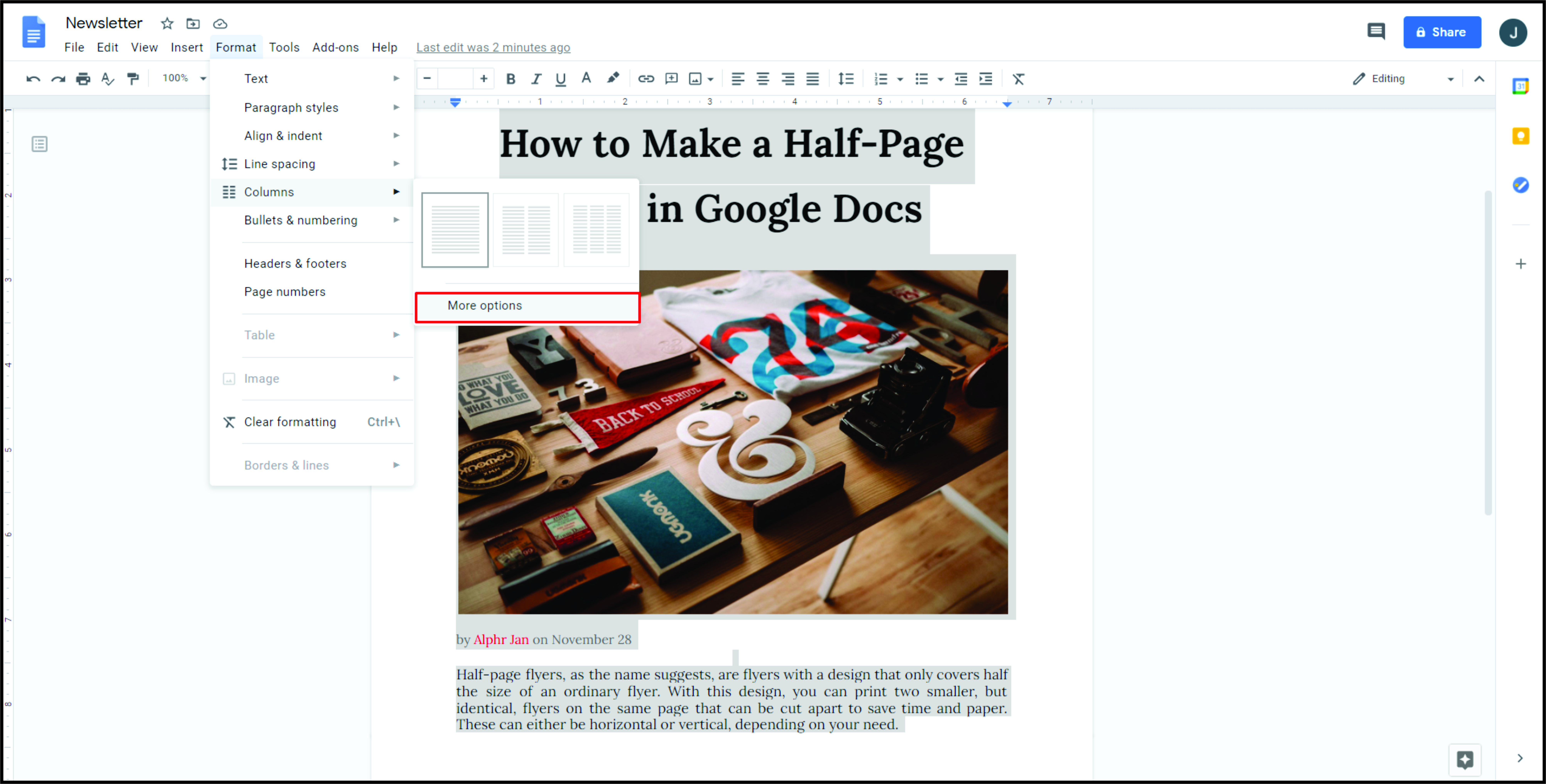 To create a half-page flyer, you can use several techniques, and they’re detailed below: