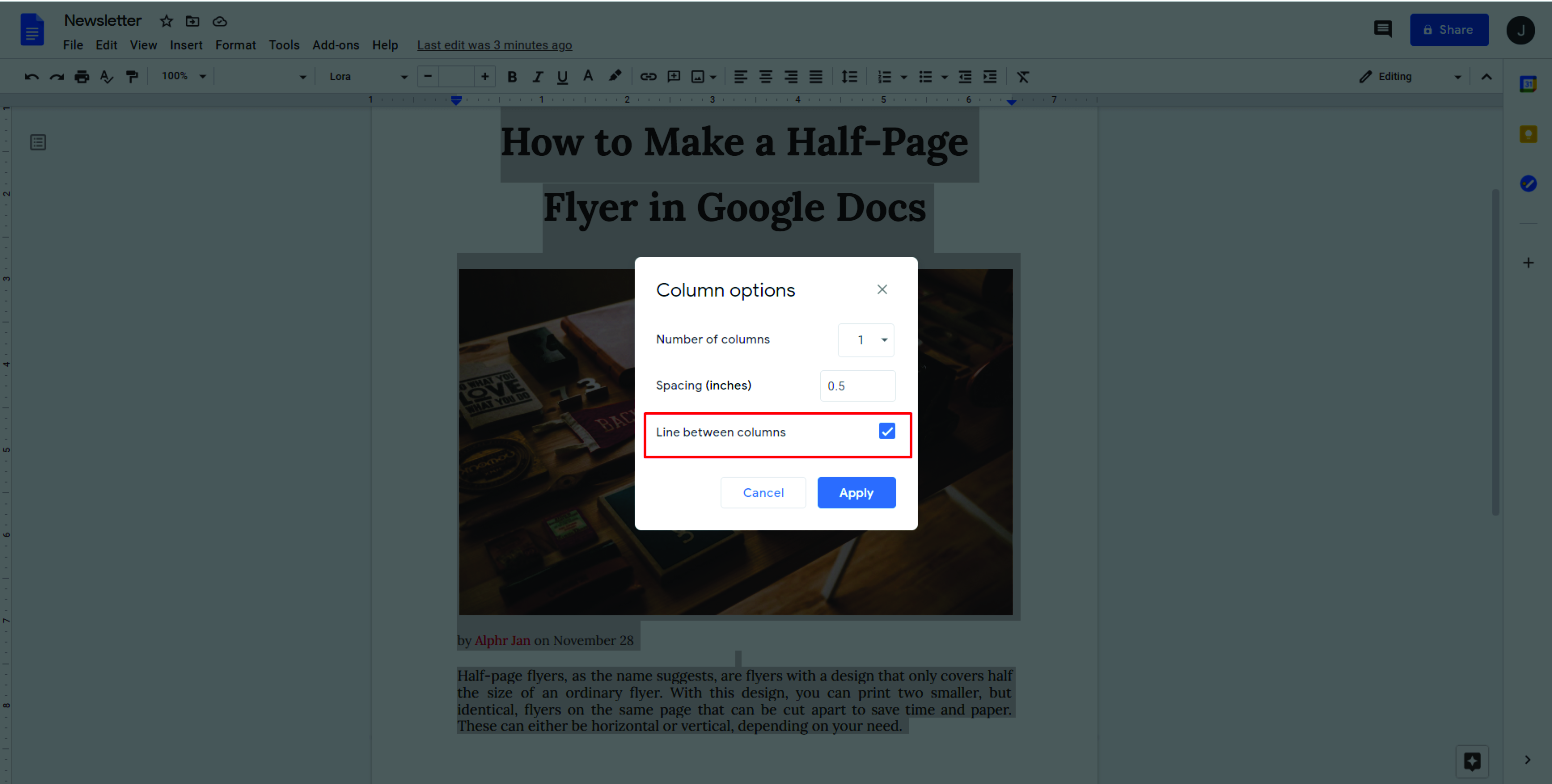 Google Docs is a handy way to make documents as it’s both free and not operating-system dependent. All you need is an internet connection to start making the flyers you need. To do this, follow the steps as detailed below: