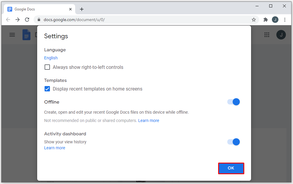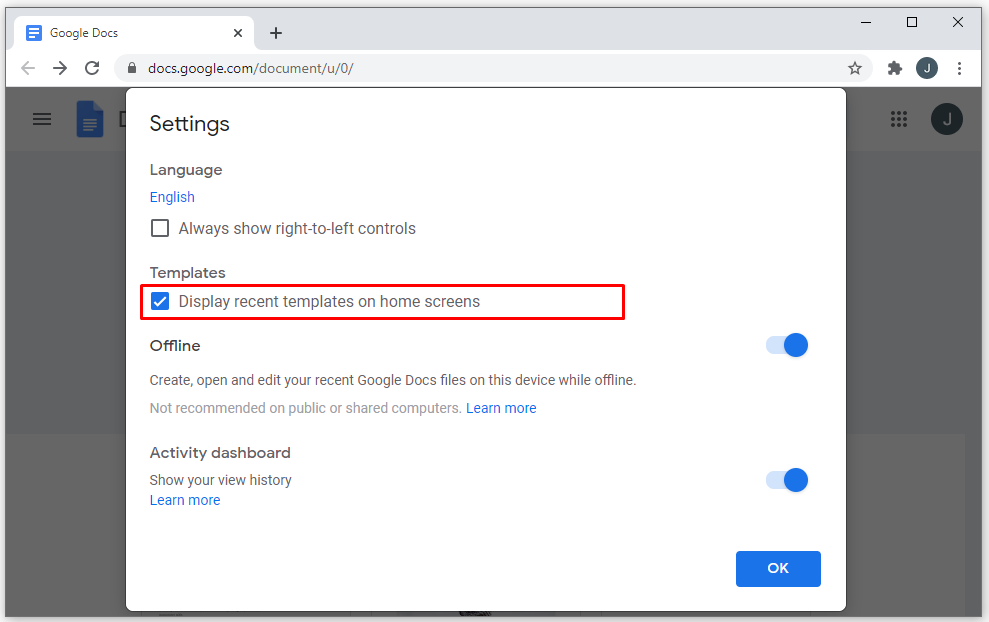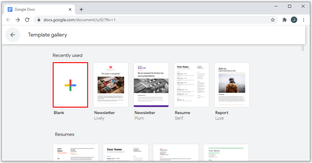- To do this, click on the Template gallery button on the upper right side of your Google Docs homepage.