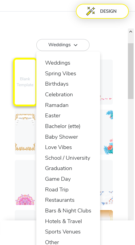 - Next, select a category for your filter from the drop-down list on the left. There are a range of them from Weddings to Baby Shower.