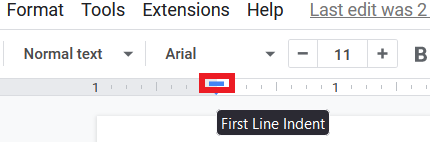 - The blue line on top of the left side blue arrow is the first line indent. This is important if you use tabs for paragraphs. To move it, click and hold as you did for the down arrows. Usually, if you move the left indent, the first line indent will move as well. Clicking and holding on the first line indent will move it separately.
