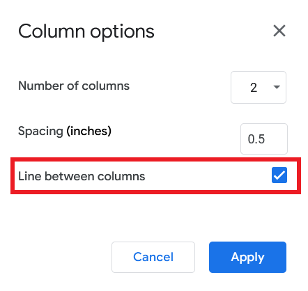 - If you wish to make a line between the columns, open the formatting options under columns and toggle on the Line Between Columns.