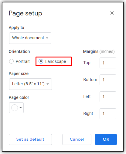 - Click OK. Alternatively, if you’re going to make several new horizontal-oriented documents, click on Set as Default to keep this setting. You can toggle this off again later.