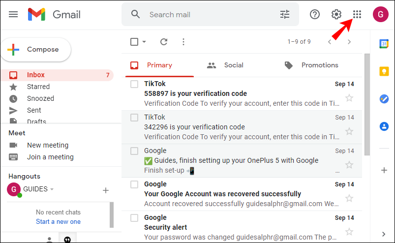 - From your Gmail inbox, click the Google Apps icon at the upper right corner of the screen (a square of nine dots next to your profile image).