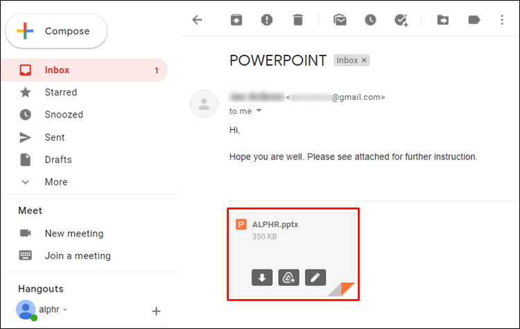 - In the lower portion of the e-mail you should see the attached presentation file. Hover the mouse cursor over the attachment.