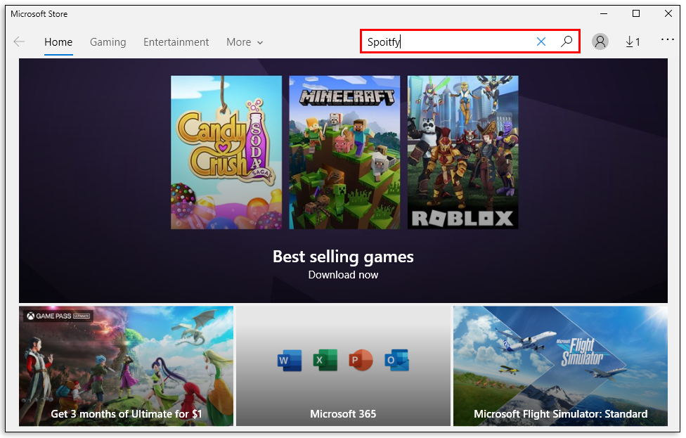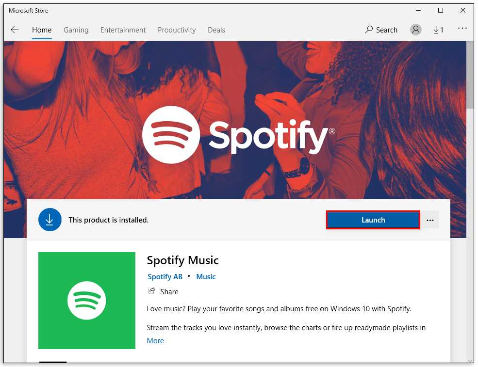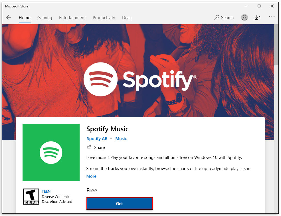 - Select “Spotify Music” and press the blue “Get” button to download it.