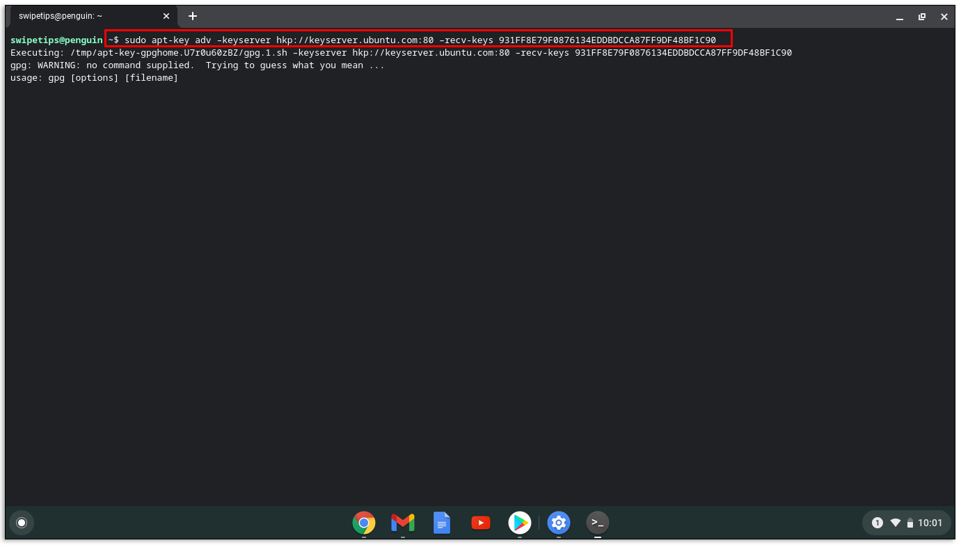 - Add the repository signing keys to verify the download. Type in the following command: sudo apt-key adv –keyserver hkp://keyserver.ubuntu.com:80 –recv-keys 931FF8E79F0876134EDDBDCCA87FF9DF48BF1C90