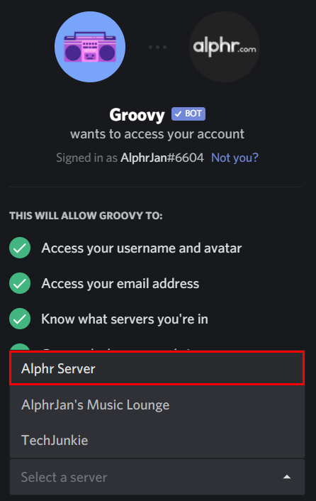 - From the menu, press the name of the server on which you wish to install the Spotify Discord bot.