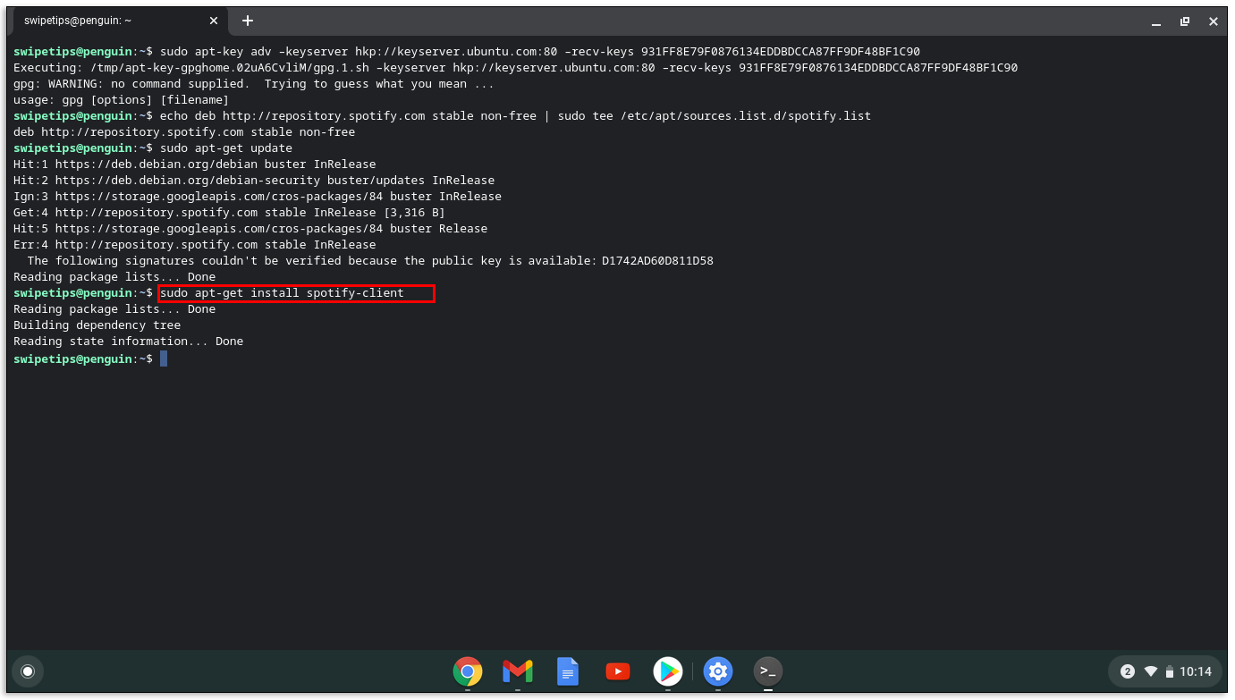 - Install Spotify by entering the final command: sudo apt-get install spotify-client