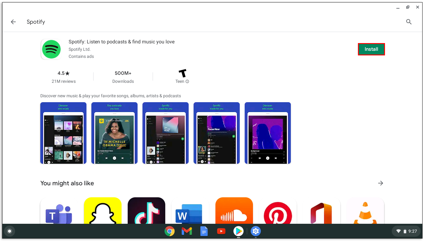 You have two options to play Spotify on a Chromebook. The first one is to download the Android version of the app: