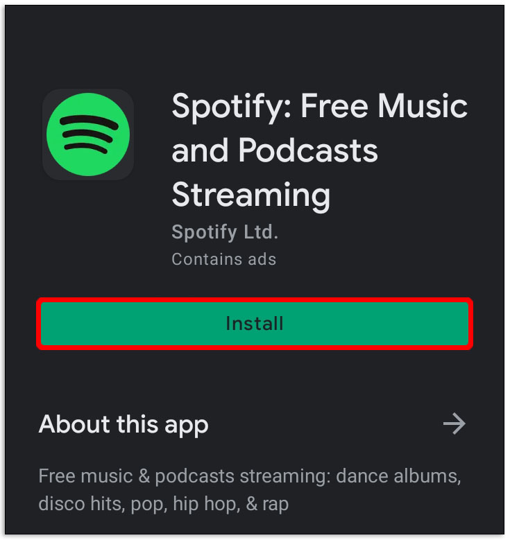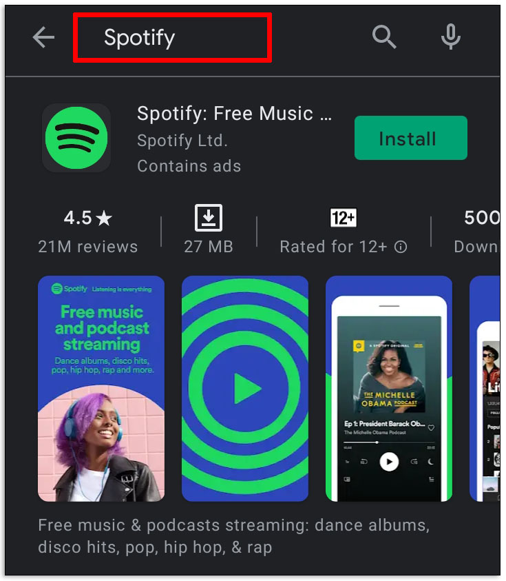 - Go to the Play Store and type in “Spotify” in the search box to find the app.