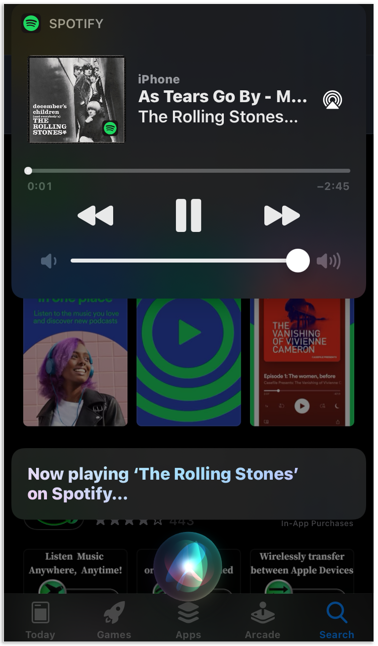 - Ask Siri to play music on Spotify. You could say: “Siri, play Rolling Stones on Spotify.”