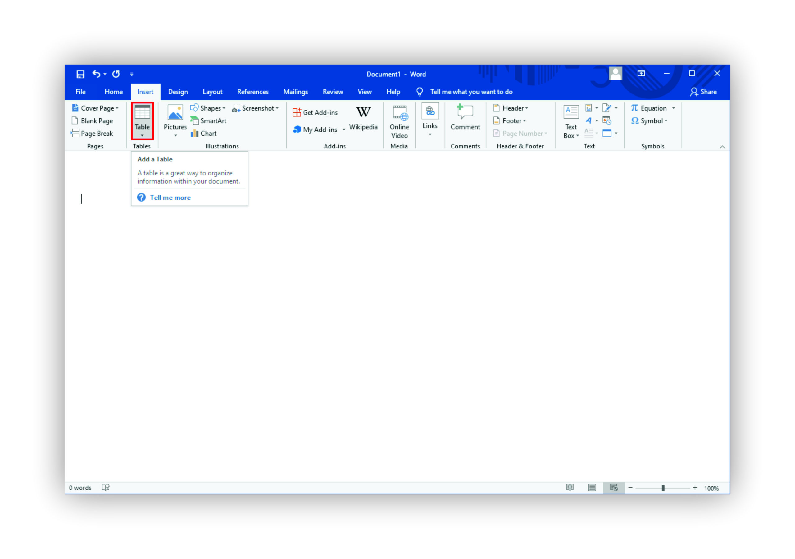 The “Layout” tab you click on is a new blue text tab that corresponds to the table you created. It’s not the black text “Layout” tab that appears in every Word document. This tab appears when you highlight the table and appears near the end of the standard tab selections.