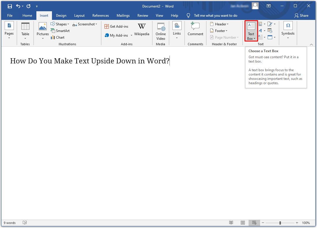 It’s not easy to flip text upside down in Word, but there is a way that you can make the text box work this way for you. Unfortunately, you can’t change settings to type the text upside down. But you can do this: