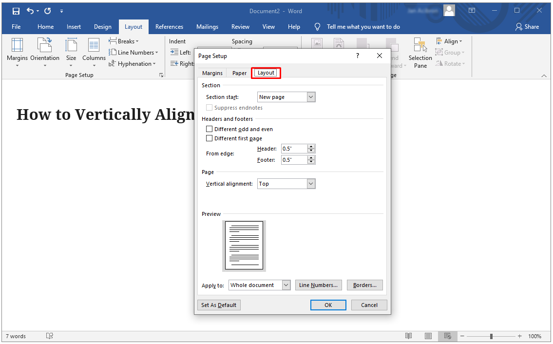 - Select the “Layout” tab from the “Page Setup” dialog box.