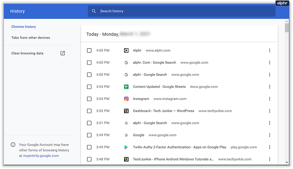 - Open Chrome on your PC, then open the History tab. Use the shortcut Ctrl + H (or Command + H on Mac), or go through the Options (three dots) menu to access it.