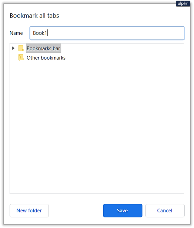 - A dialogue window will open with a textbox and a folder map of your bookmarks. Your tabs will be saved as a list of bookmarks in a folder of your choice.