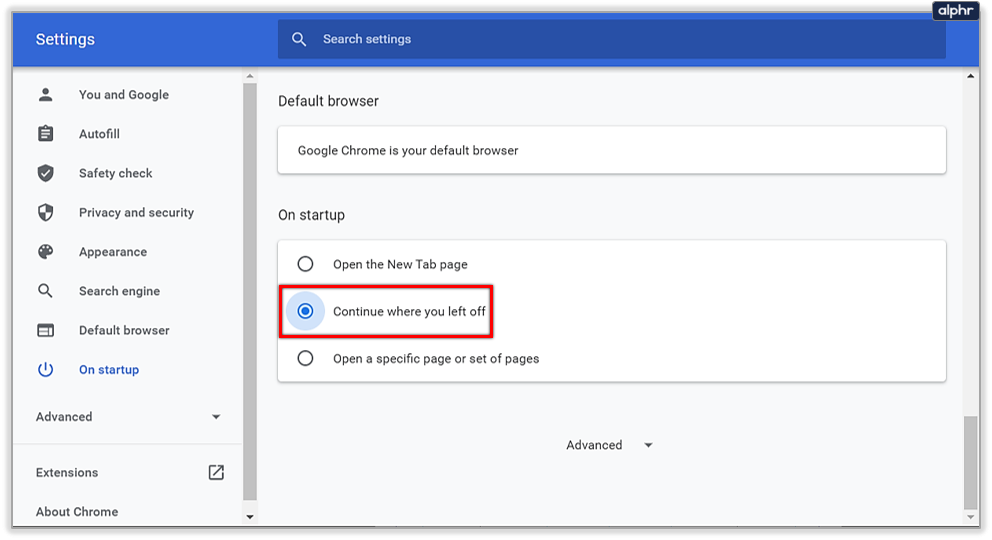 - Choose the option “Continue where you left off.”