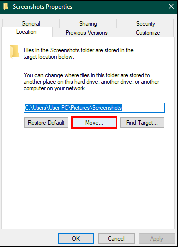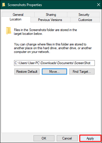 - On the screen that appears, select “Apply” and then “OK” to finalize your change to the default screenshot save location.