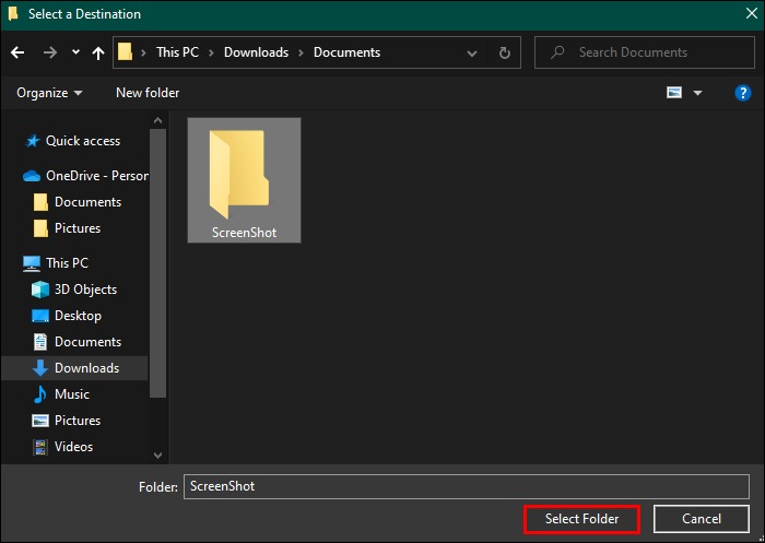 - Navigate your way to the new “Screenshots” folder you made and hit “Select Folder.”