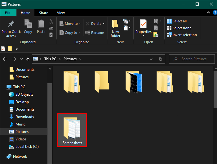 - Locate and select “Screenshots” to gain access to all of the screenshots you’ve saved using hotkeys.