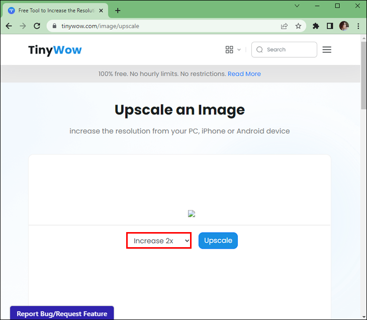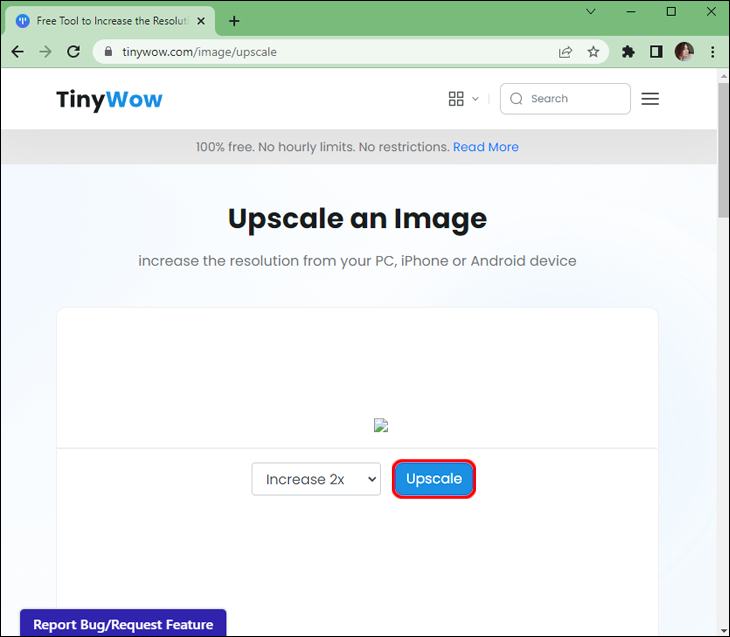 - Navigate to the TinyWow Image Upscaler.