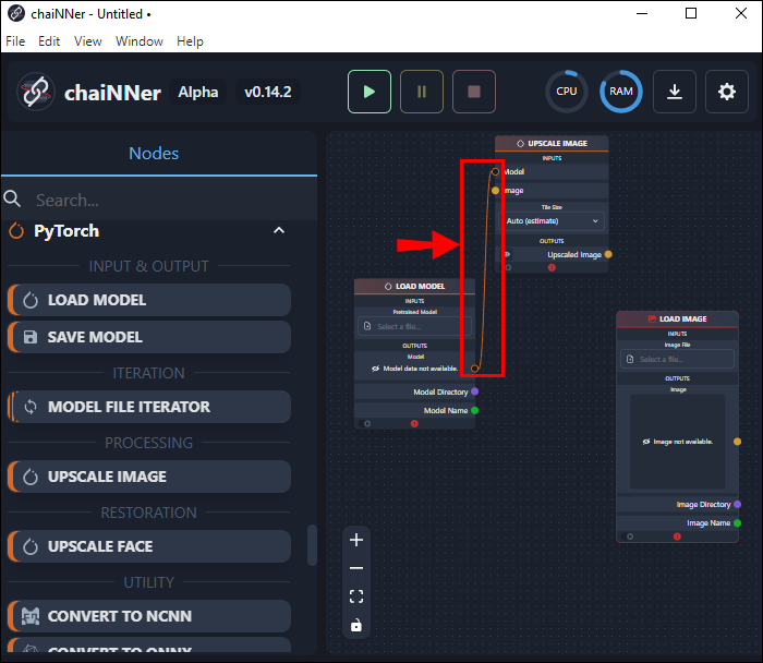 - Within the Load Model box, click and drag a line from the word Model and release it in the Upscale Image box next to the word Model.
