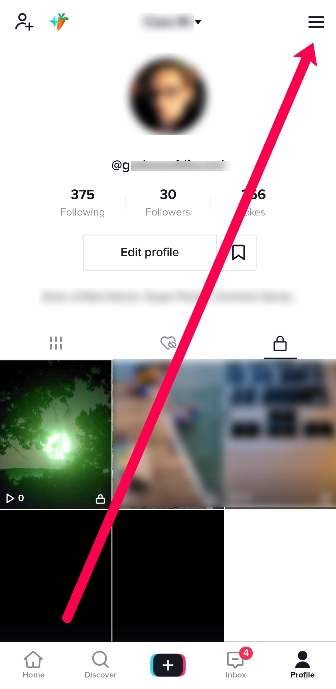 - If you need to access TikTok’s Settings tap the three line menu icon in the upper right corner. Here, you can change your privacy settings, and more.