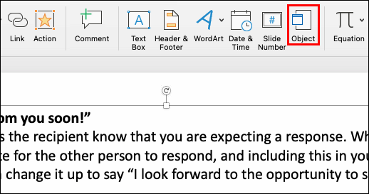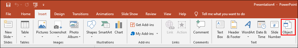 - Navigate to “Insert,” followed by “Object.”