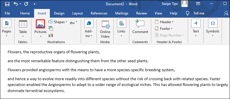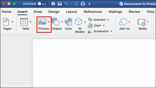 - A Word file will open automatically. To add an image, you can drag and drop it into the file or go to “Insert,” followed by “Pictures.”