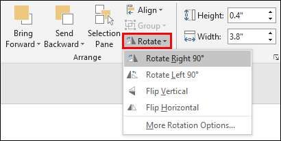 - Press “Rotate” to access a menu with text rotating options. Here, you can choose to turn the text left or right by 90 degrees. Alternatively, you can flip the box horizontally or vertically. To enter a specific degree, press “More Rotation Options.”