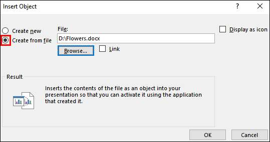 - Check the “Create from File” option and select the word file you previously created.