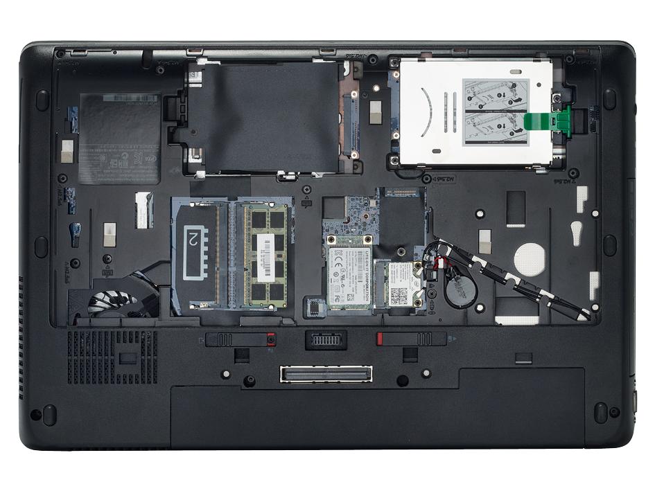 Flip the ZBook upside down, flick a latch and a metal access panel slides off to give access to the internal components. Here, there are two 2.5in drive bays (one is free), an mSATA slot, a mini-PCI Express slot (filled with the Intel Centrino wireless card) and an empty M.2 slot. There are two RAM slots, with a further two hidden underneath the keyboard.
