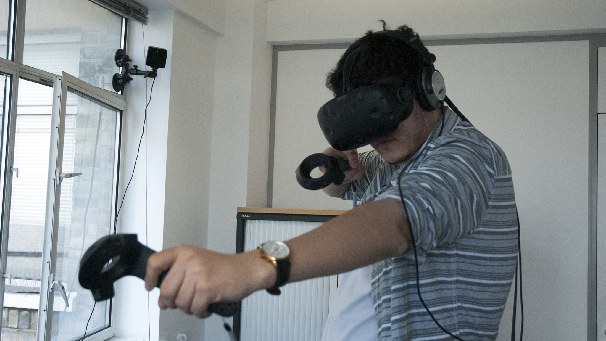 HTC doesn’t mention the need for high ceilings, but in general, Vive can work in a space up to 4 x 4m, and both beacons need to be at least 2m off the ground to track you. If you want space around you for others to watch or walk without getting in the way of the sensors, you’ll need a lot of space.