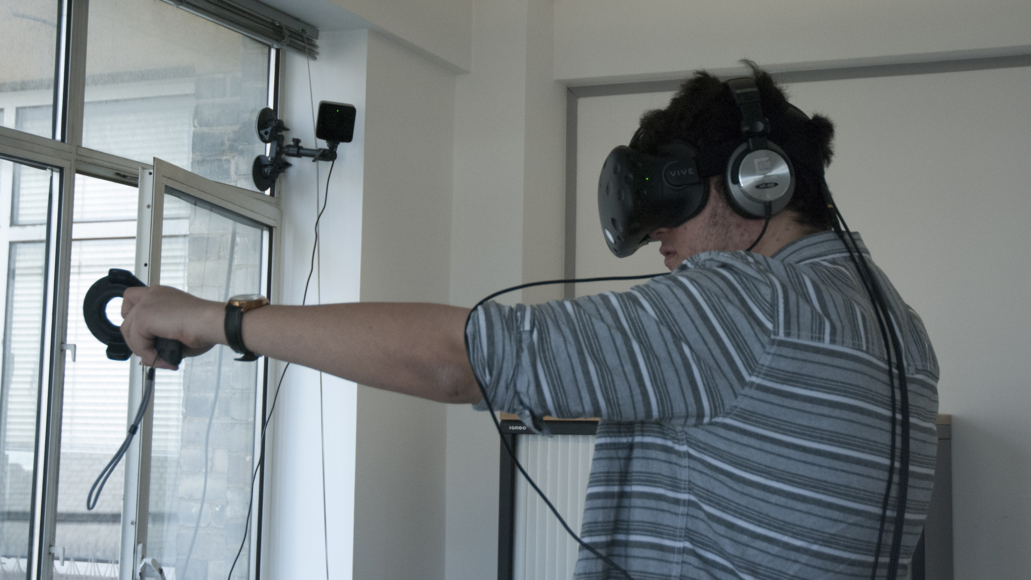 I accept that this process will be different for everyone. The first hurdle I came across was that I wasn’t able to screw brackets into our testing room wall, which meant finding a way to place Vive’s beacons at their minimum required height of 2m was rather difficult. Most people won’t have an issue with this, though, as the included brackets seem incredibly simple to screw in and clip on to each Vive beacon.